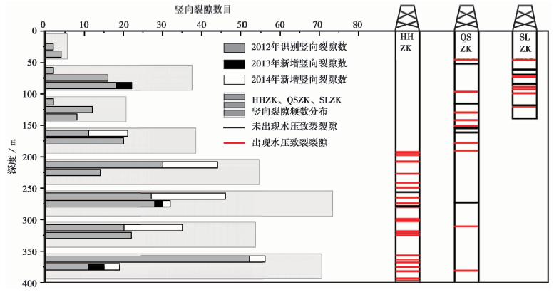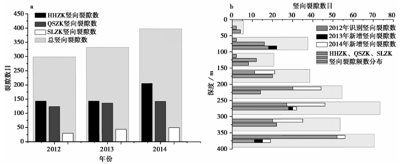 获取到详细的竖向裂缝数据后, 综合分析3个钻孔中竖向裂缝随时间及钻孔深度的变化。 图7a展示了裂缝数随时间的变化, 竖向裂缝的总数与3个钻孔中各自的裂缝数目均随时间出现增加的现象, 其中QSZK的裂缝数目呈逐年增加的变化趋势, SLZK与HHZK中的竖向裂缝数目分别只在2013年与2014年出现增加。 在随深度变化方面, 如图7b所示, 竖向裂缝的整体数目有超过70%出现在钻孔深度> 150m的位置, 其中SLZK由于录井资料不全(深度< 170m), 只有已记录范围内的裂缝数; QSZK与HHZK 2个钻孔的裂缝主要分布于深200~400m处, 且新增裂缝也都出现在这一优势深度范围内。