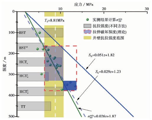 绿色圆点与绿色直线为实测应力值计算得到的井壁拉伸应力大小及其与深度的拟合关系。 为进一步确定井壁破坏条件, 本研究采用多种方法对所取的岩心样品进行了抗拉强度测试(邢博瑞, 2014; 王成虎等, 2017), 包括巴西劈裂垫条实验(BST)、 巴西劈裂角锥实验(BST#)、 空心岩柱实验(注油HCTo、 注水HCTw)以及直接拉伸实验(TT), 所得到的岩石抗拉强度为6~11MPa(淡黄色部分)。 进而对比井壁拉伸应力随深度的函数关系图可知, 深约150m以下的钻孔井壁的应力条件就已经满足拉伸破坏条件, 这也与实际观测中70%以上竖直裂缝位于钻孔200m以深的情况相符, 也进一步肯定了钻孔中存在自然生长的裂缝。