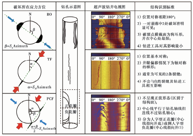 | 图 4 钻孔破坏结构示意图及识别标准(Zhang et al., 2010; Patlan et al., 2012)Fig. 4 Schematic diagram of borehole failure structure and identification criteria (after Zhang et al., 2010; Patlan et al., 2012). |