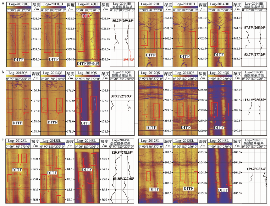 本研究使用ALTABI40超声波钻孔扫描测试仪, 对布设于山东省潍坊市昌乐县红河镇(HHZK)、 临朐县上林镇(SLZK)以及昌邑市石埠镇(QSZK)的3个深孔进行扫描录井, 再将超声波测井仪获得的数据导入WellCAD 4.3软件进行分析, 结果如图 5 所示。 从中获取完整的录井影像资料后, 据此识别出单个裂缝。 竖向裂缝的信息识别通常分为2步: 1)创建 “ 钻孔破坏” 日志将其覆盖于声波电视图像之上, 在 “ 钻孔破坏” 日志中创建相对应的裂缝矢量图; 2)通过角度转换将日志中的视方位角调整为真方位角, 进行结果分析。 图 6 给出了3个钻孔中几处典型的钻井诱发裂缝(DITF)位置处的井下电视图像。 需要说明的是, 在第1次录井工作之前并未进行过压裂工作, 故可以确定如图所示的3次录井资料中同时存在的竖向裂缝均为钻孔诱导的拉伸裂缝(DITF)。
