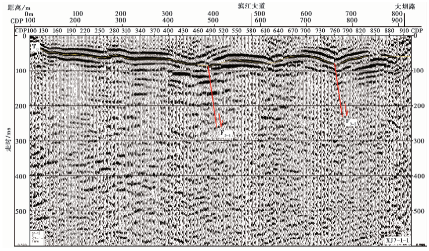 为进一步揭示断裂的展布与活动性, 在断裂隐伏段布设了7条跨断层的浅层地震勘探测线( 图 1), 采用多次覆盖观测系统的地震纵波反射探测方法对其进行了探测。