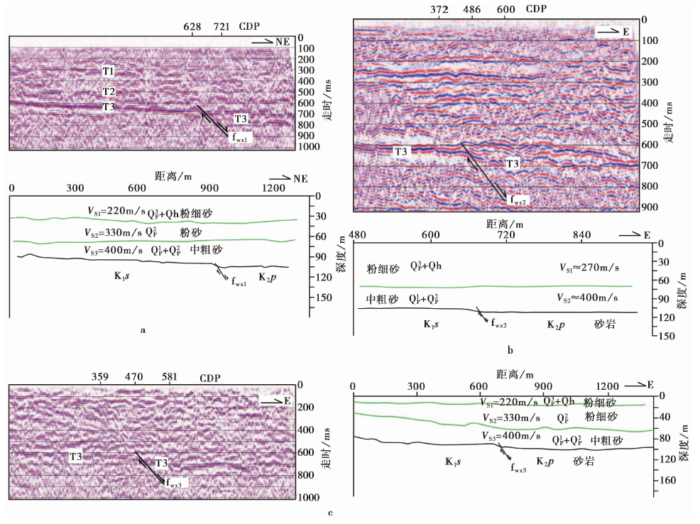 fwx1 断点: 位于Wx1测线上, 由断点局部叠加剖面( 图4a)可以看出, 基岩反射波组(T3)在断点处明显不连续, 判断为fwx1 断点。 断层表现为正断性质, 倾向NE, 视倾角约为60° , 断距约为 9m。