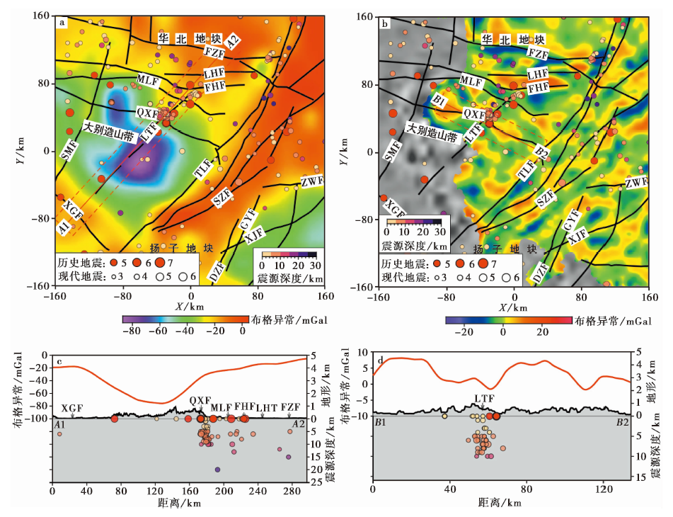 据安徽省地震监测中心正式地震目录记载, 有现代地震记录以来, 大别造山带东段绝大多数的3.0级以上地震震源深度< 15km, 最深不超过30km。 现代地震震源深度基本处于布格异常小波分解5、 6阶细节结果对应的场源深度范围内。 以5、 6阶细节结果之和为浅部(高频)布格异常( 图11b), 以6阶小波逼近结果为深部(低频)布格异常( 图11a)讨论大别造山带东段布格异常与地震活动的关系。 从震中分布情况来看, 大别造山带东段地震活动主要沿着落儿岭-土地岭断裂分布, 在青山-晓天断裂和落儿岭-土地岭断裂交会的霍山地区尤为集中。 为直观展示重力异常与地震活动关系, 沿地震集中分布带(落儿岭-土地岭断裂)方向, 同时也是近垂直于重力异常高梯度带的方向设置剖面A1A2, 将其两侧15km范围内的地震投影至该剖面, 绘制深部布格异常-地形-地震剖面图( 图11c)。 采用同样的方法, 在地震活动集中区沿青山-晓天断裂方向设置剖面B1B2, 绘制浅部布格异常-地形-地震剖面图( 图11d), 对于无震源深度信息的历史地震, 均将其绘制在0深度处。