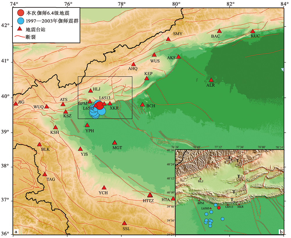 伽师6.4级地震的震中位于南天山、 塔里木盆地和西昆仑-帕米尔3个构造系统交会区附近。 该区域曾于1997— 2003年发生了1组6级强震群: 1997年1月21日— 4月16日, 伽师发生了7次6级地震, 这些地震构成了中国大陆极为罕见的伽师强震群活动(赵翠萍等, 2008); 1998年8月2日、 27日又分别发生了MS6.0、 MS6.4地震; 2003年2月24日, 在该区东南部的巴楚县境内发生了MS6.8地震。 陈杰等(2001)根据刘启元等(2000)的深部构造研究, 推测南天山山前深部存在“ S” 形的阿图什断裂, 认为1997年伽师中强震群型地震(包括1997年1月17日— 4月17日7次6级以上地震)可能是阿图什断裂中段NW— NNW向断裂活动的结果。 徐锡伟等(2006)根据卫星影像及高分辨折射地震探测剖面成像结果推测, 1997年6级震群的发震断层为NW向隐伏 “ 类转换断层” , 2003年巴楚-伽师6.8级地震的发震构造为尚未出露地表的近EW向盲逆断层系。 但总体来看, 由于伽师震源区未发现断层出露的痕迹, 故迄今为止这一系列强震的具体发震构造尚不十分清晰(刘启元等, 2000; 陈杰等, 2001; 李松林等, 2002; 张先康等, 2002; 周仕勇等, 2006)。 1997年强震群发生后的深部研究结果表明(刘启元等, 2000; 张先康等, 2002), 塔里木与南天山的地壳速度结构差异显著, 伽师震源区的地壳变形明显。 另外, GPS观测资料还揭示了整个天山的缩短存在由西向东逐渐衰减的趋势(王琪等, 2000; 张培震等, 2002)。