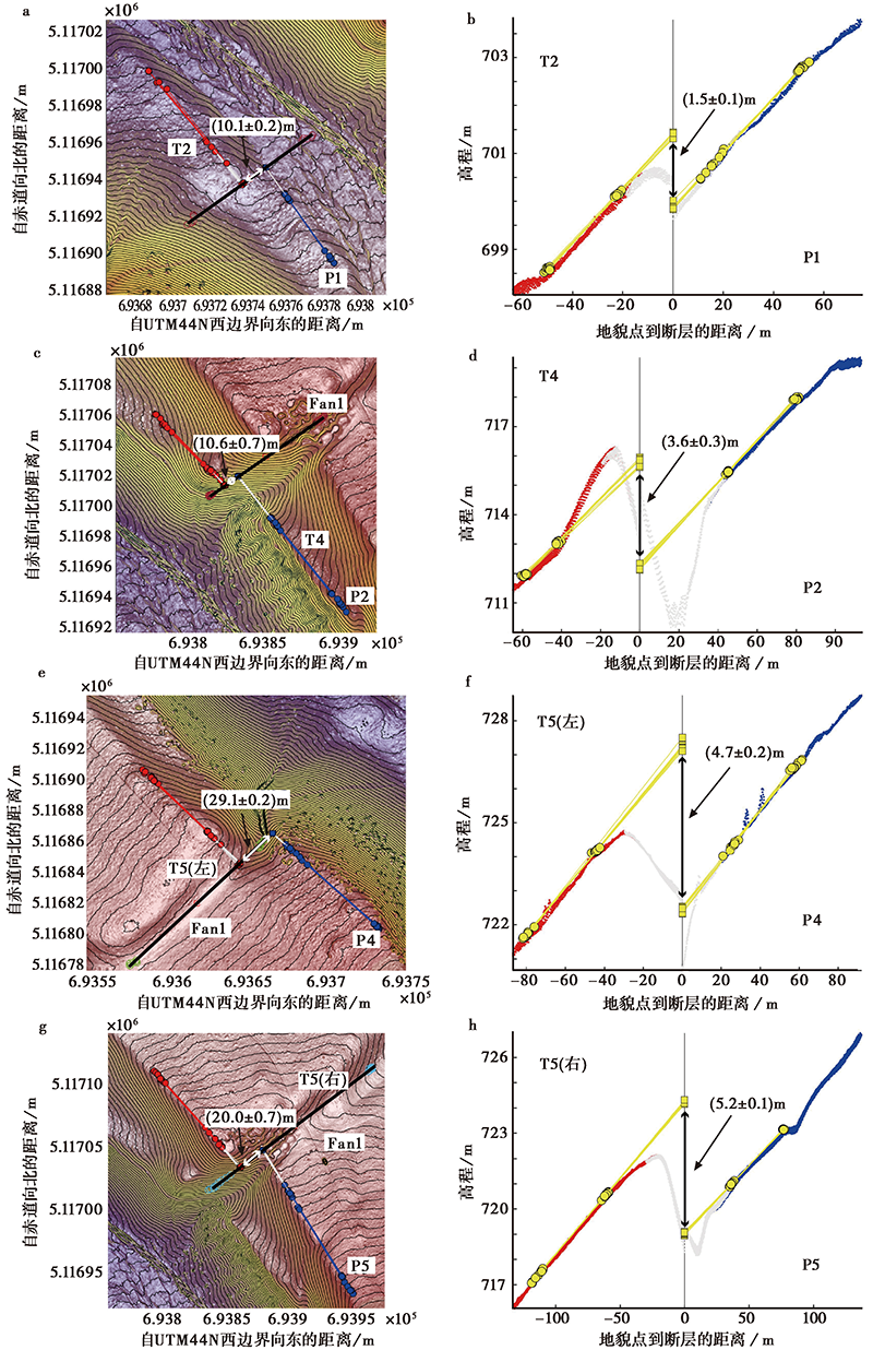 为获得阿合别斗河段断层活动的位移数据, 我们利用无人机获取了该区域的高精度DEM数据(图3d), 并结合Olaf Zielke开发的DispCalc_Bathy_v2程序对断层的位错量进行了测量。 将目标区域的DEM数据导入该程序之后, 进行以下操作:1)根据影像上的断错地貌选取2个地貌点进行连线以确定断层位置; 2)在断层两盘进行地貌点选择确定被错断的线性标志物(如河流冲沟、 山脊、 河流阶地前缘等)的分布形态, 此步骤可获得所测量测线位置的水平位错量(图4a, c, e, g)以及测线的高程剖面; 3)选取高程剖面上的2点对高程剖面进行线性拟合, 两盘在断层位置的高程差值即为断层的垂直位错量(图4b, d, f, h)。 该程序在测量断层垂直位错时利用了弯折剖面的测量方法, 与简单的直线剖面测量方法相比能更加真实地反映断层的垂直位错量, 减少地形因素的影响(Langridge et al., 2017)。 为减小操作过程中人为造成的误差, 每条测线的地貌点选取均进行10次。 剖面位置见图3d(P1—P8), 测量结果见图 4 和图 5。