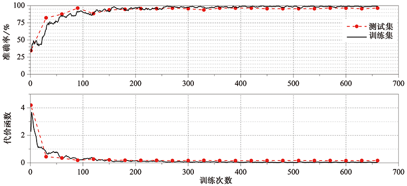 表1为AlexNet、 VGG16、 VGG19、 GoogLeNet 4种结构的卷积神经网络的最终训练结果统计。 可见, 最终各类结构对训练集与测试集的识别准确率均达到93%以上。 其中, AlexNet网络结构的识别准确率最高, 其训练集准确率高达100%, 测试集为98.51%, 且未发生过拟合(图 4); VGG16、 VGG19网络结构的准确率次之, 而GoogLeNet网络结构的识别准确率相对较低。 对于各类结构的训练集与测试集的代价函数而言, 其最终均低于0.194。 因此, 利用人工智能深度学习可以很好地实现天然地震与爆破、 塌陷等事件类型的自动识别, 且AlexNet结构的卷积神经网络学习训练效果最佳。